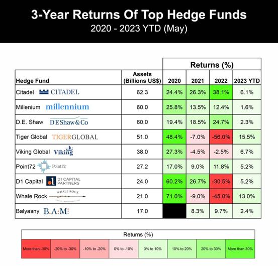 网上还有人将老虎基金弟子们的对冲基金进行了比对,可以看到三个亮眼的红色方块统统出现在2022年期间,D1资本和WhaleRock属于极具代表性的“跟风买入”策略,重仓大量明星个股;老虎环球显然更大胆,几乎是哪只风险高重仓哪只。