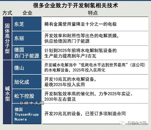 在设备开发及商业化方面走在前列的也是欧洲厂商,比如固体高分子型设备厂商德国西门子能源、从事碱水电解的德国ThyssenKrupp Nucera等企业,致力于增强生产设备及装置大型化。此外,以从事可再生能源的企业等为主,通过水电解制氢的大规模项目也在推进。