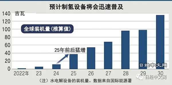 水电解设备将从2025年前后开始全面实现实用化。原因在于,随着世界各国引入更多的可再生能源,使用剩余电力来制氢的需求将会高涨。国际能源署(IEA)的统计显示,截止到2022年,累计装机量为1吉瓦左右,到2030年,预计将扩大到约134吉瓦,相当于目前日本发电设备容量的约40%。