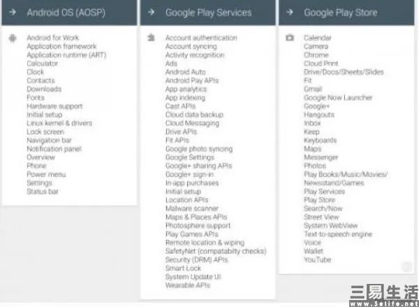 此外AOSP也不包含谷歌的软件应用套件,例如Chrome浏览器、YouTube,甚至Google Play商店。也不包括谷歌的一些底层技术和API,而这些技术和API则可以实现移动支付、语音命令和云存储等功能,但它们都是作为GMS单独授权的,并且这一授权是收费的。换而言之,谷歌免费提供给外界的AOSP负责给Android扬名,GMS则负责依靠Android的市场份额挣钱。