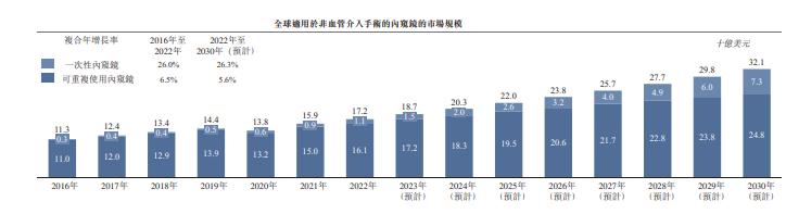 沙利文数据显示,2016年至2022年一次性内窥镜市场规模从3亿美元增长至11亿美元,预计全球一次性内窥镜市场规模将从2023年的15亿美元增长至至2030年的73亿美元。