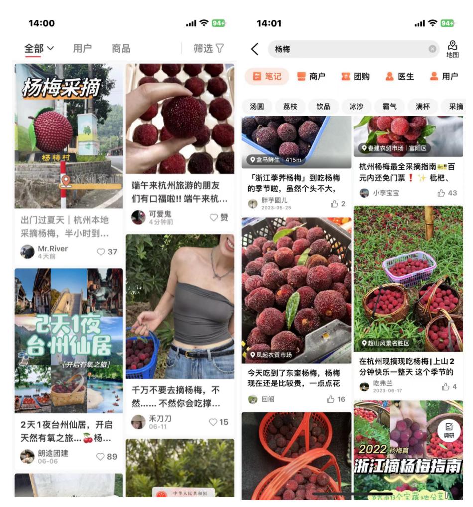 近几年,目的地营销逐渐成为旅游业内的新思路。类似草莓、蓝莓、杨梅采摘,旅游业消费和当地农产品消费相互带动,捧红了不少原本被大热门景区所掩盖的周边小众去处。小红书、大众点评搜索“杨梅”,不乏很多旅游打卡种草笔记。