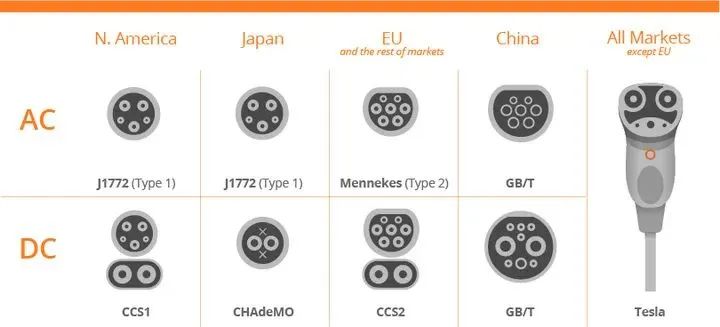 目前国际上主要有五种充电标准,分别是:中国 GB/T 标准、日本 CHAdeMo 标准、CCS 标准(美标、欧标)、特斯拉 NACS 标准。
