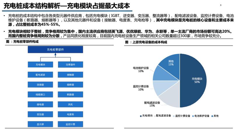 虽然比换电站便宜,但充电站的成本还是很高,充电桩成本构成主要为充电模块(30kW 单个 2000 元)、充电枪线(5 米 5000 元)、主控板(1500 元)、触摸屏+互联网模块+壳体+线束+继电器(400 元/kW)。