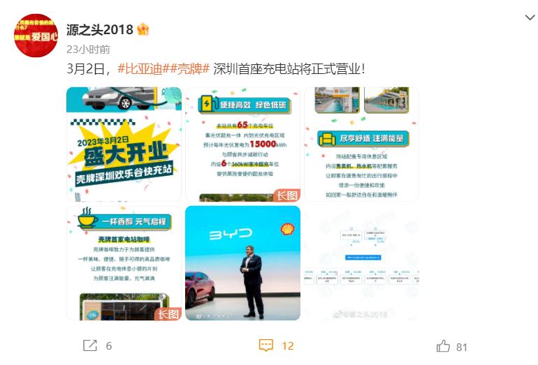他们与壳牌联手,在深圳推出第一个比亚迪充电站,该充电站最高功率可达 360kW,共有 65 个充电车位,站点设置 24 小时人员值守。