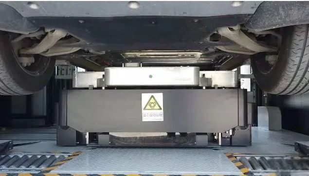 在换电过程中,换电站有专门的值守专员接管车辆,推杆会将车辆推至水平居中的位置,换电机器人 RGV 会进行更换电池的动作。