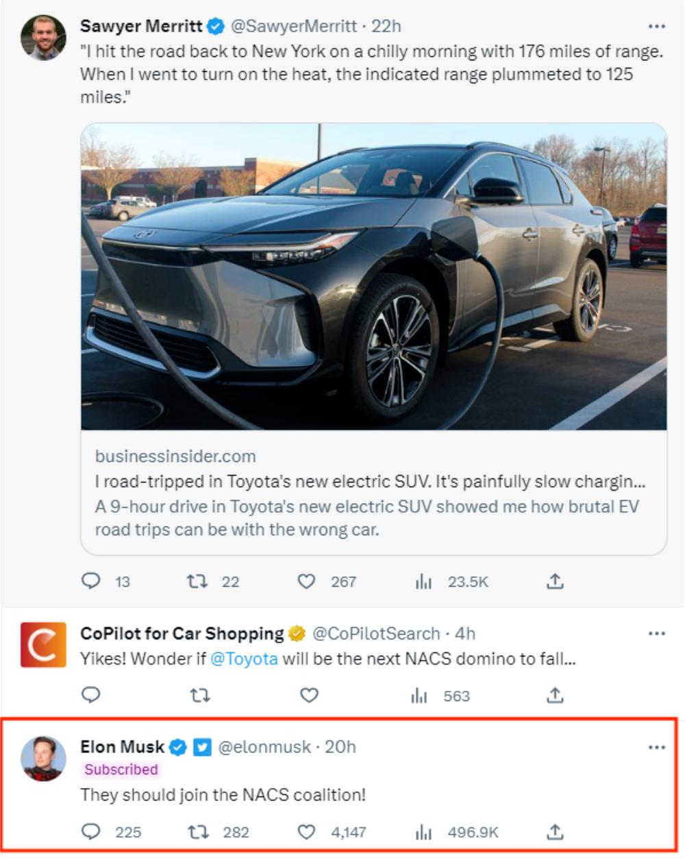 马斯克还打起日系的主意,在推特邀请丰田一起加入到特斯拉的充电网络中。