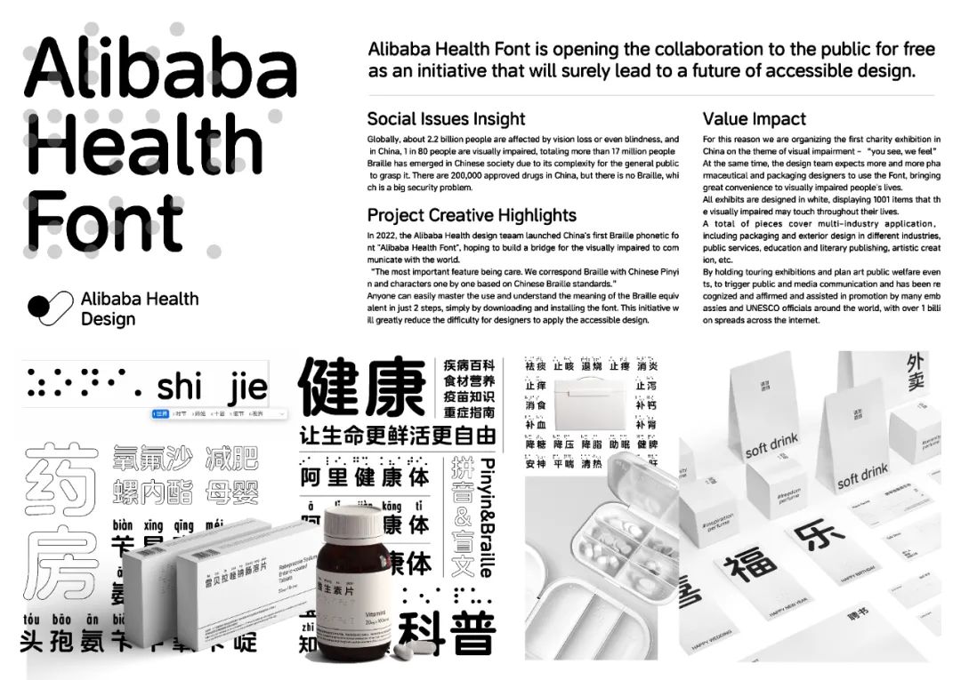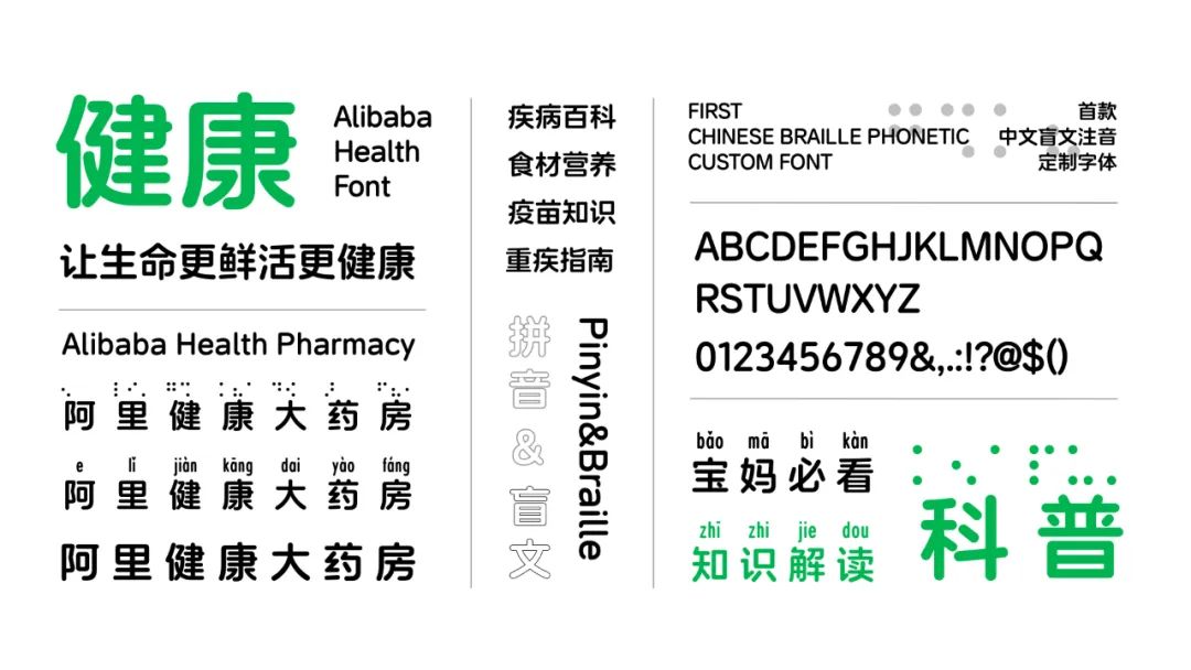 为了帮助1730多万视障群体安全用药,阿里健康设计委托方正字库,联合设计开发出首套中文+盲文+注音的定制字库——阿里健康体,已应用于盲文药盒、健康品外包装、健康指南等领域。
