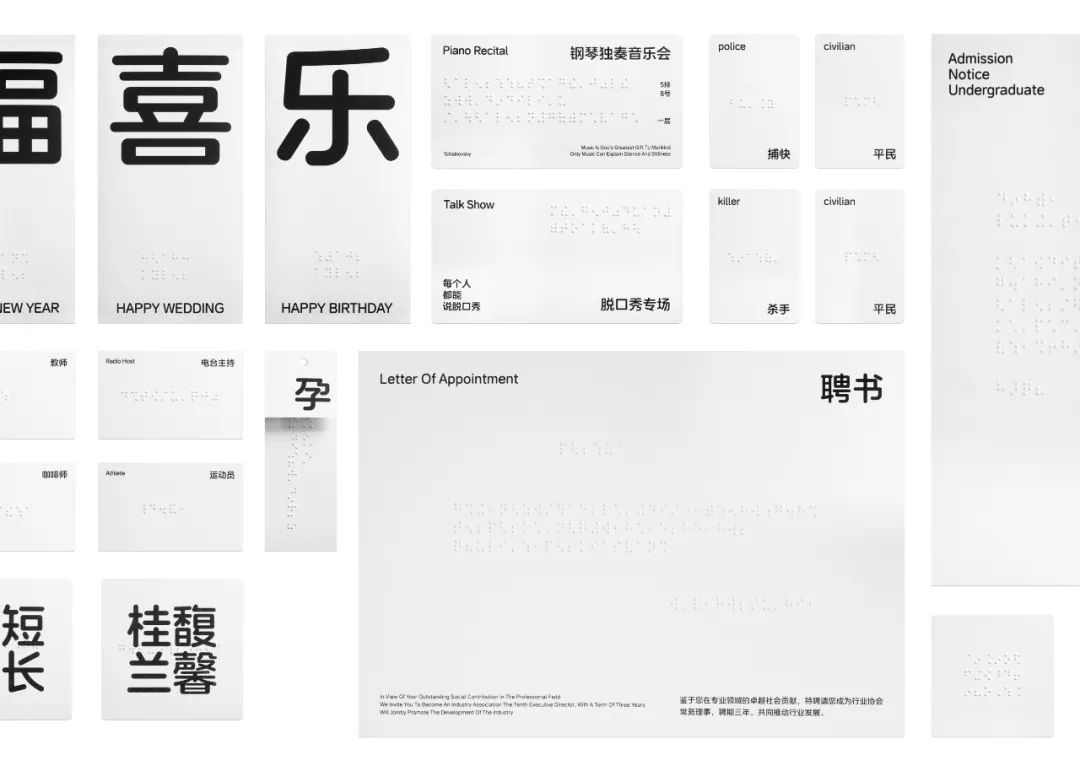 同时,张晗也坦言,在执行过程中会遇到一些挑战。虽然一直从事各种健康和医疗的项目委托,但面对关于盲文的无障碍设计时,是需要有足够的专业知识辅助。中国盲文是汉语双拼的盲文方案,所以使用中遇到多音字、数字符号等都需要针对性的处理,对于盲文的规则与盲文具体语境下的使用方式,也需要通过实践来获得认知。其次是当面对开放性议题的时候,无障碍设计需要有足够的包容和善意的解决方案,恰当的处理创作者与使用者之前的关系,平等的、普惠的解决方案。