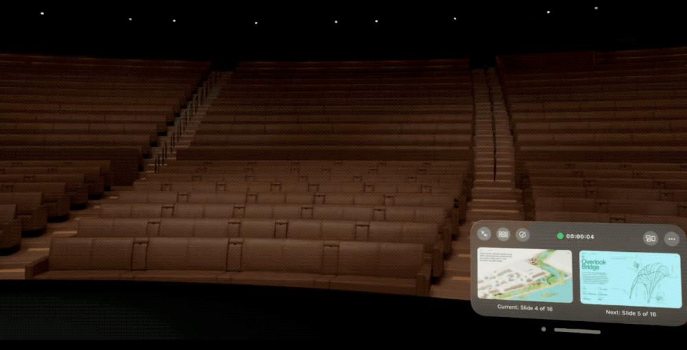 在头显应用内的Keynote排练演示功能中,用户将进入一个环绕式剧院内,而演示的文稿则会在左下角显示。这样的方式,就让用户和登上大舞台的演讲家一样,而Keynote则成为了提词器面板。