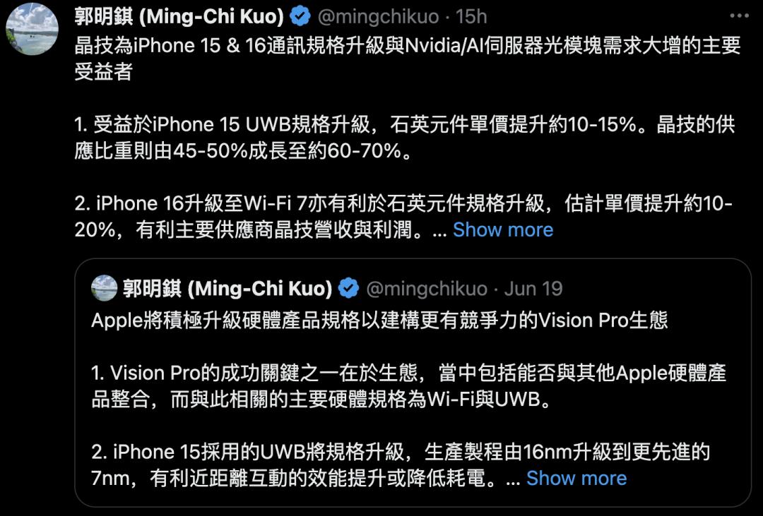 Vision Pro发布后,苹果分析师郭明錤也在近日发表了他对Vision Pro的最新看法,并对苹果进行了一些预测。他认为,iPhone 15将配备超宽带芯片,该芯片将改进与Vision Pro的集成。同时,Apple积极升级iPhone硬件产品规格以建构更有竞争力的Vision Pro生态。