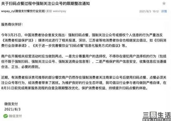 要知道,根据《消费者权益保护法》第九条第二款的规定,消费者有权自主选择商品品种或服务方式。换而言之,如商家强制必须扫码才能点单,就是很典型的违法行为。而强制扫码点单不得人心,其实并不是现在才有的新鲜事,消费者对此的吐槽其实已经持续了多年。而早在2021年,微信方面就曾向开发者推送了关于自查“扫码点餐强制关注公众号”问题的通知。