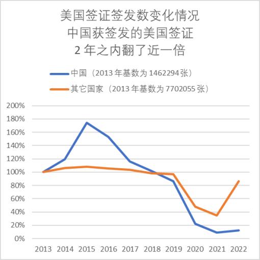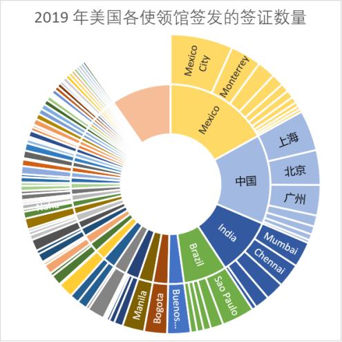 由于中国访美需求的持续增加,因此,在2009-2019年的十年间,中国一直是美国签证签发的主要对象。2019年,美国总共签发了874万张非移民签证,其中中国境内各签证处占127万张(15%),仅次于墨西哥。