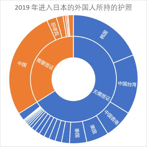 例如,在日本外务省的统计中,2019年,获得免签入境的外国人达2060万人次,占了日本3119万入境外国人的三分之二;而中国护照持有人以848万人次的数量,占了需要签证才能入境的外国人(1059万人次)中的八成。