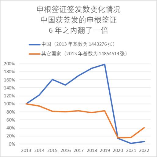 申根签证的情况则正好相反——由于推行多次签证的进度和长度(申根多次签多只有五年)不如美国,因此申根签证的申请人数在疫情前居高不下,越来越高。