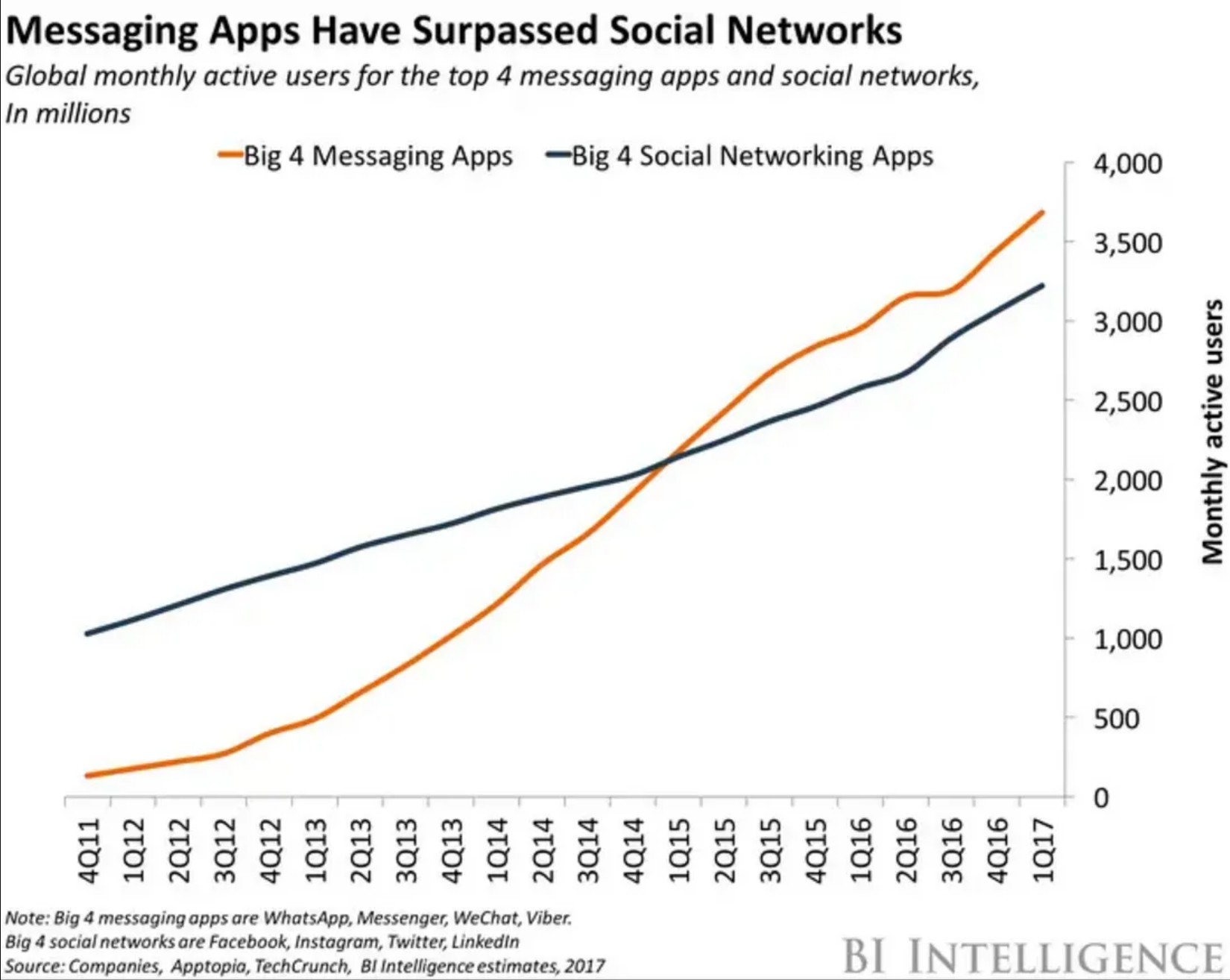 聊天应用月活用户数已超越社交网络,资料来源:BI Intelligence