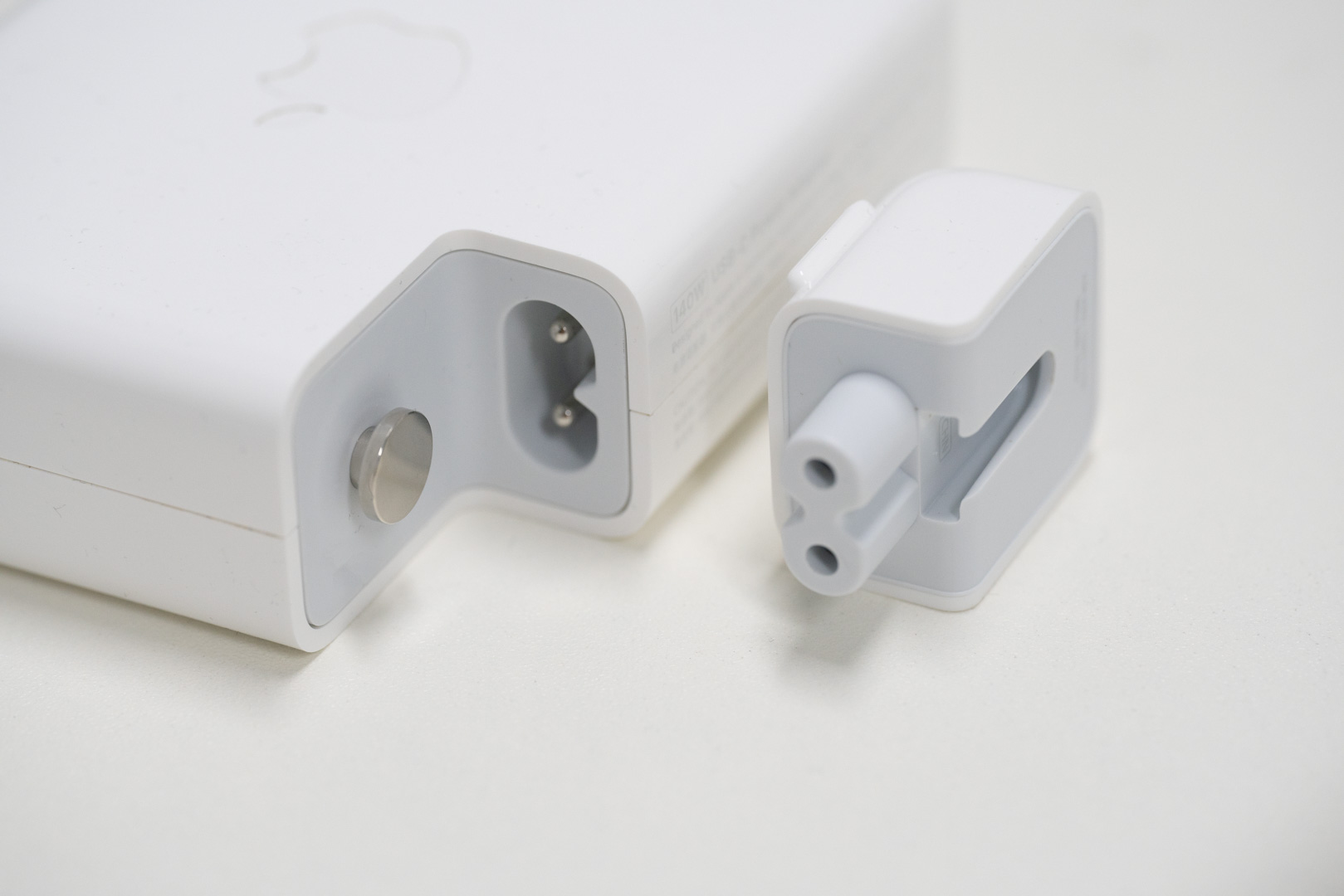 为了方便在全球各市场使用同一款电源适配器,Apple为MacBook笔记本电脑配备了可以拆卸插头的宽幅适配器,只需要更换适配器前端的插头就可以匹配不同市场的插座规格。