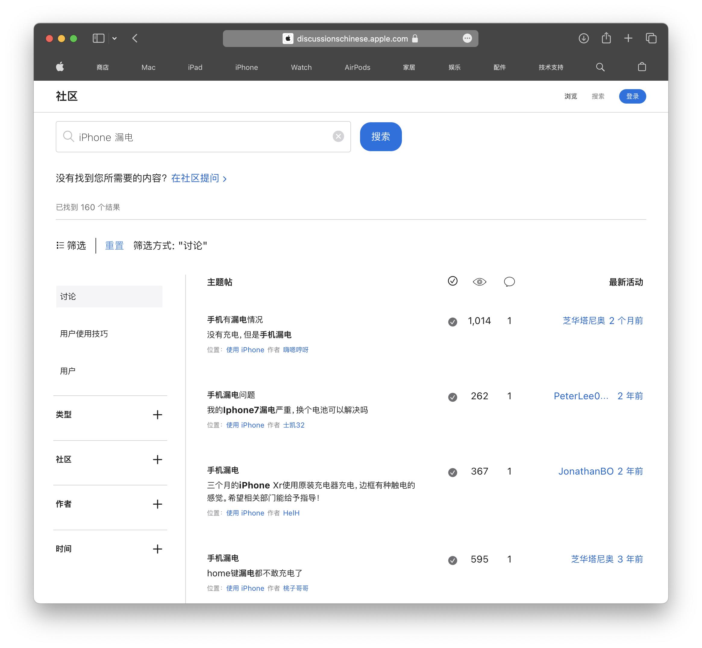 在Apple网页的支持社区里搜索「漏电」,我们可以看到不少和漏电相关的求助。有一说一,这些主题讨论中有不少讨论都是围绕手机耗电速度过快的「漏电」,但不可否认的是,这些最早可以追溯到9年前的讨论帖中,确实有不少是触摸iPhone会被电到的求助。比如在2014年4月,一位使用iPhone 4S的用户就表示「手机充电时接电话漏电」。