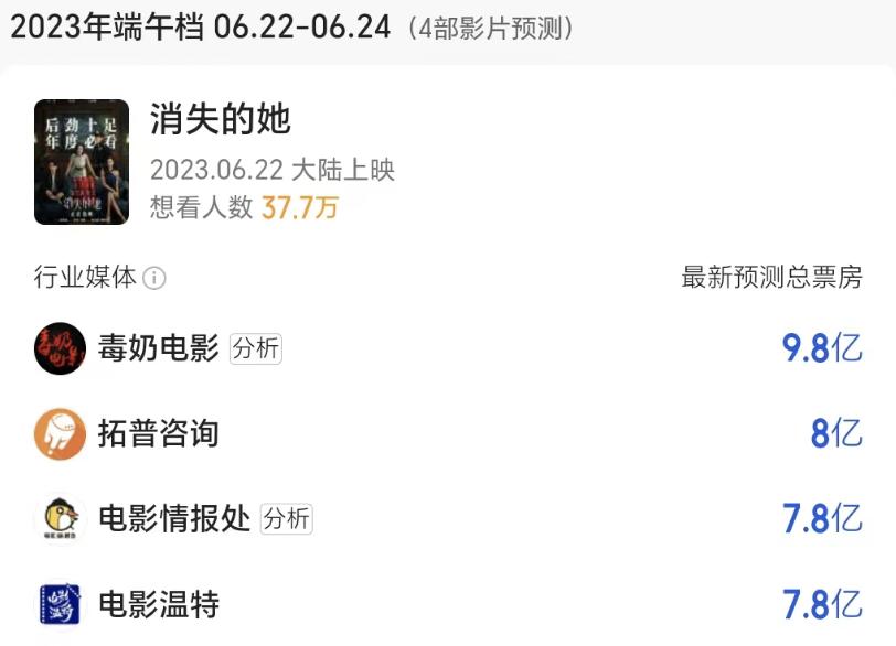 确定由朱一龙饰演男主何非时,去年暑期档那部黑马之作《人生大事》还未上映,如今他成为内娱新晋影帝,加上自带的路人盘与粉丝效应,已经成为该片最大卖点。再加上倪妮与文咏珊这对美艳姐妹花,在各个平台的发酵都可谓话题性满满。即便如此,buff叠满的《消失的她》在各大媒体的超前预测中,也只有8亿左右的总票房。