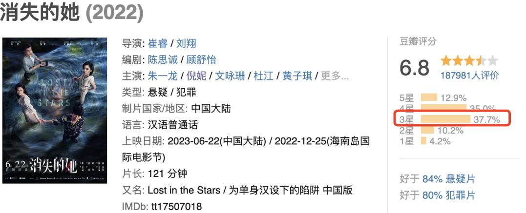 豆瓣许多用户都认为《消失的她》悬疑不足、反转僵硬、缺乏逻辑、吃女性题材红利,只是陈思诚又一部“圈钱之作”。
