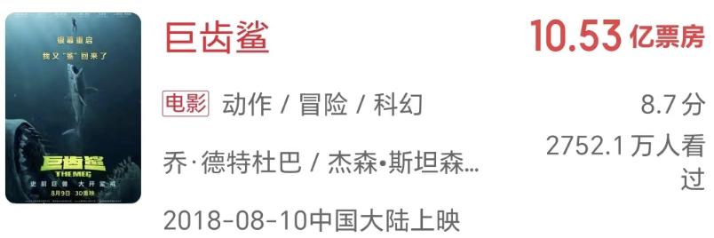 2018年上映的《巨齿鲨》属于合拍片,由杰森·斯坦森领衔主演、大花李冰冰加盟,国内票房高达10.53亿,全球票房则是5.33亿美元。