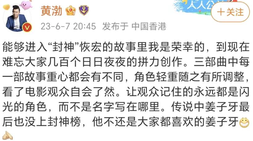 月初,《封神》在微博公开回应观众争议,称《封神》是以商王殷寿与西伯侯姬昌为核心展开,因此与2019年公布的《封神三部曲》演员排序有所不同。黄渤与费翔先后转发官博回应,黄渤还在微博公开表示,“让观众记住的永远都是闪光的角色,而不是名字写在哪里”。