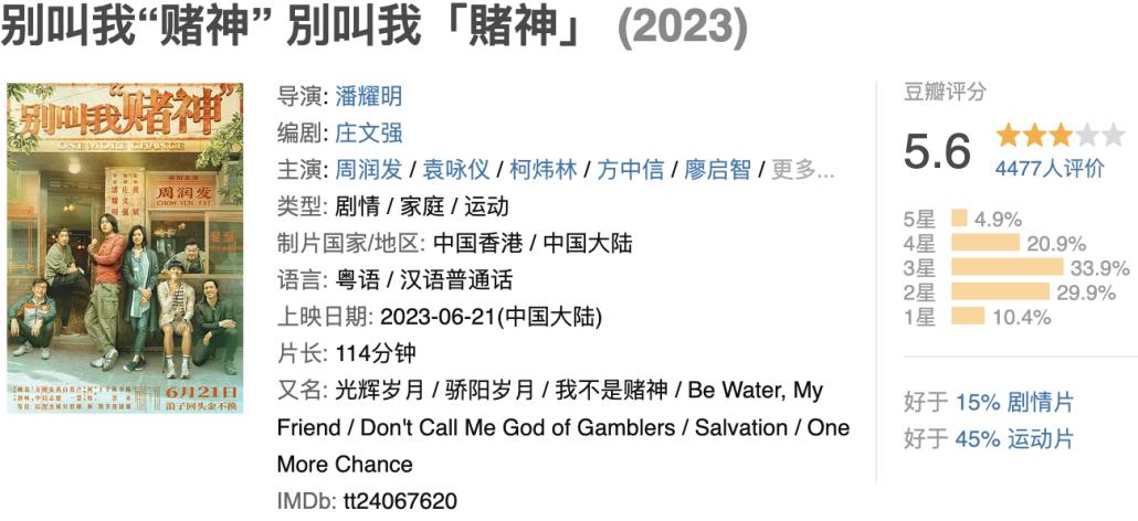 其次,是过亿都难的国产片。发哥“复出之作”《别叫我“赌神”》映前就被观众质疑炒冷饭,上映之后果不其然,票房不足5000万,仿佛回到了90年代的港片市场。