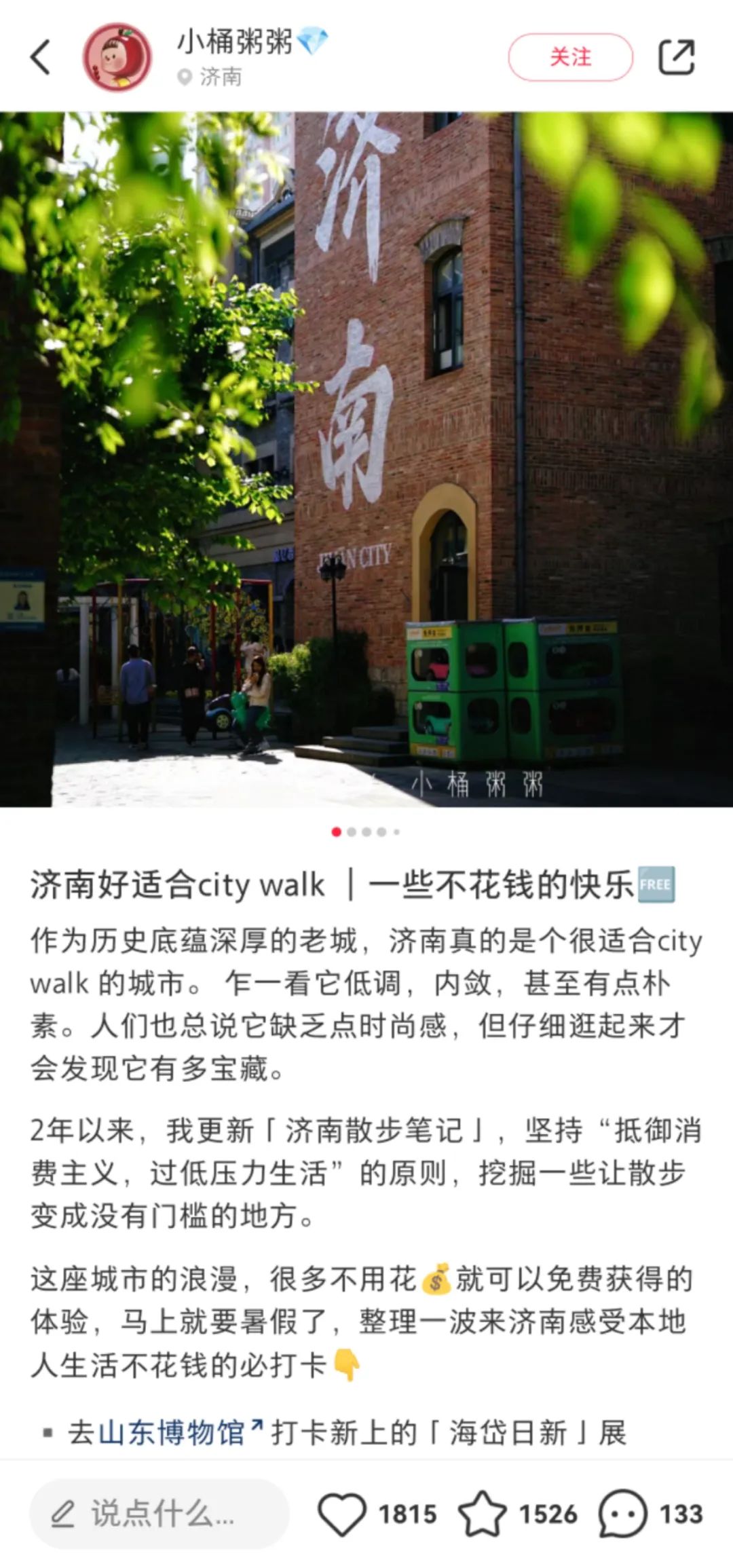 除了对陌生城市的深度游玩,City walk也有对所生活城市进行重新认知的层面。如上文中周乐所进行的沈阳城市漫游,这种城市徒步让她感觉自己重新和城市进行了连接,以一种更直接、更有趣的形式进一步了解了这座城市的文化底蕴。