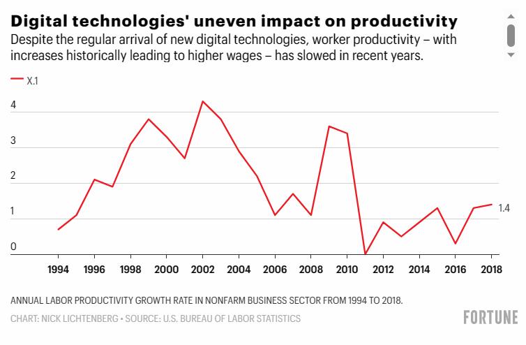 跟踪科技对经济影响的关键指标是工人生产率的增长——定义为每小时员工可以有多少工作产出。这个看似干巴巴的统计数据对每个工作人士都很重要,因为它直接关系到一个工人可以期望从每小时工作中赚取多少报酬。换句话说,更高的生产率预计会导致更高的工资。