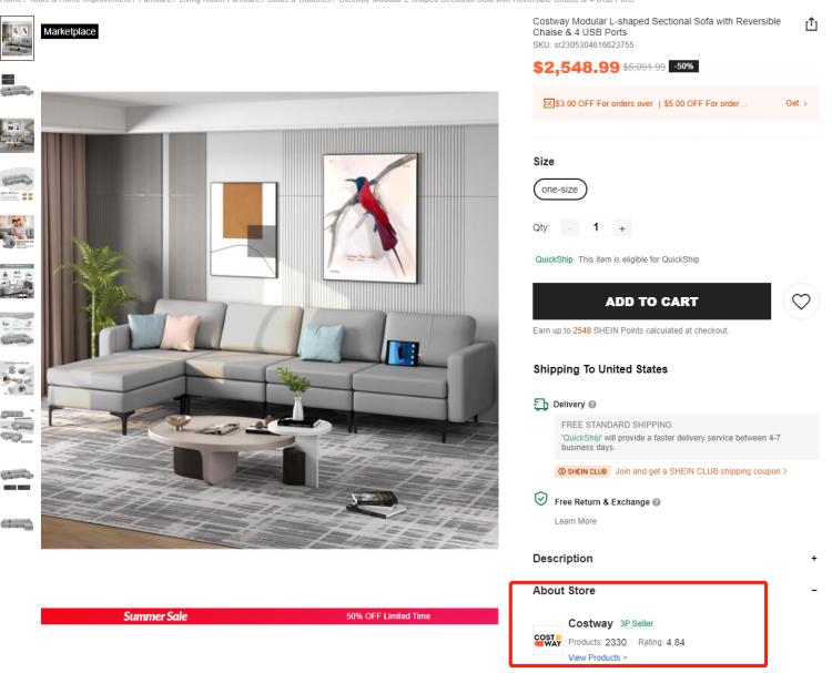 目前,SHEIN平台来自第三方卖家的产品确实不多,品玩Global观察到,这些产品带有marketplace标识。在产品详情页,消费者可浏览店铺的详细信息,店铺拥有独立页面。定价方面,目前可搜索到的第三方卖家产品单价低至2美元(非知名品牌的小体积产品),高至2000多美元(比如家居品牌Costway的沙发)。