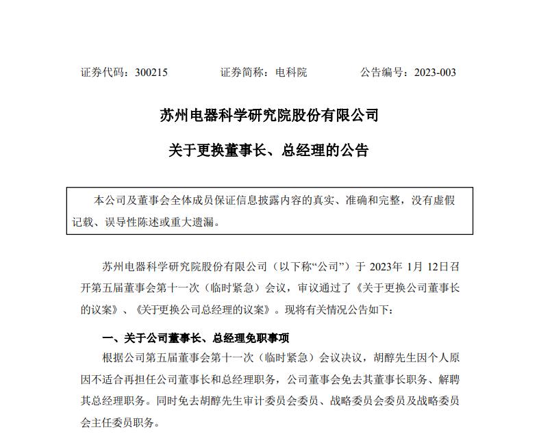 今年1月,电科院董事会又召开临时紧急会议,称胡醇因个人原因不适合再担任公司董事长和总经理职务,公司董事会免去其董事长职务、解聘其总经理职务。同时免去其审计委员会委员、战略委员会委员及战略委员会主任委员职务。