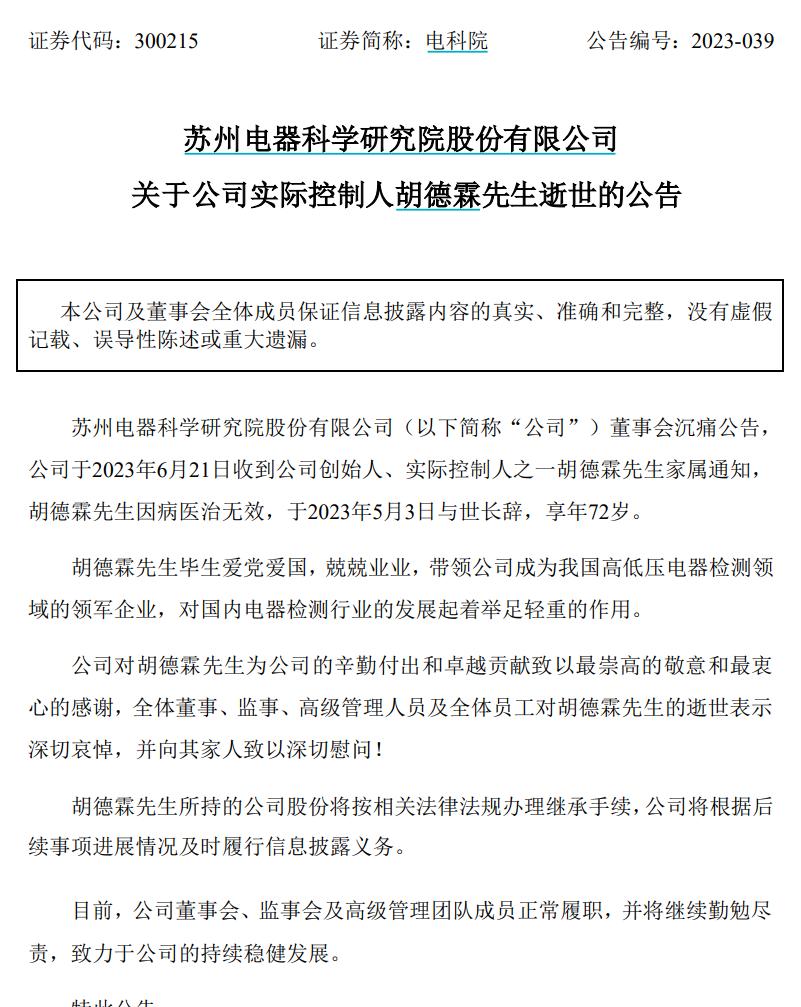 昨晚,电科院发布公告称,于6月21日收到公司创始人、实控人之一的胡德霖家属通知,胡德霖因病医治无效,于2023年5月3日与世长辞,享年72岁。