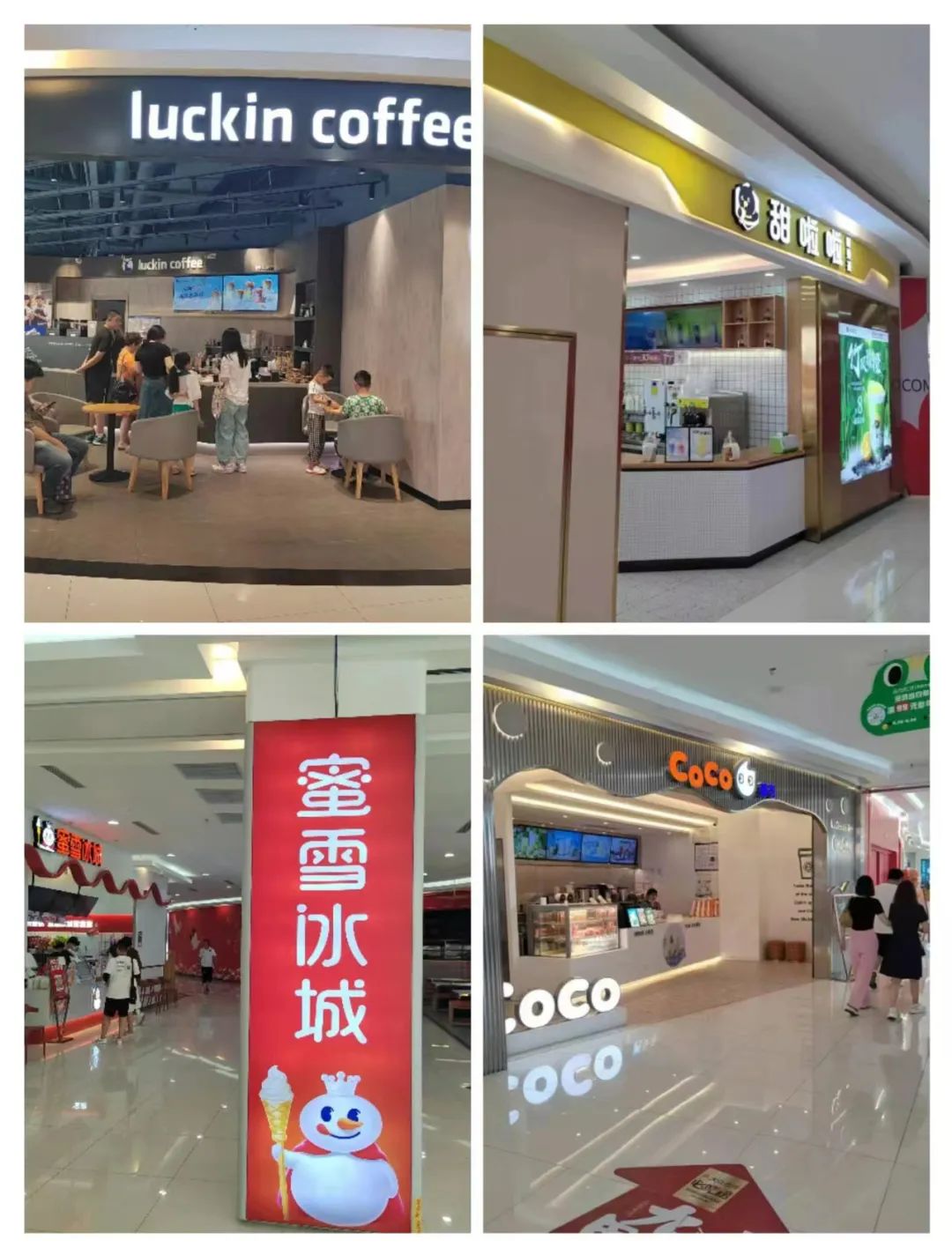 其次是喝。万达有意地把喝的都集中在五楼,知名品牌云集,有刚官宣门店数破万的瑞幸咖啡,有号称全国签约门店超6000家的甜啦啦水果茶,以及奶茶之王蜜雪冰城等,还有一些新锐品牌比如浮雪点茶、沏百杯(这家店开在瑞幸旁边,胆子真肥)。笔者观察下来,现制茶饮太卷了。蜜雪、甜啦啦、浮雪等的主力价位已杀到10元以下,最便宜的现制柠檬茶已杀到了4元/杯(蜜雪和甜啦啦都有,蜜雪多达4-5款)。4元/杯是什么概念,可口可乐经典款在便利蜂也要卖4.2元。蜜雪和甜啦啦是给你现制和加冰的,在酷暑的天气里,这就是引流款。笔者在5楼看到,蜜雪的店面比较偏,但依然能遇到排队点单的人群,COCO等品牌反而生意差一些。难怪马云说阿里要回归淘宝,白领也爱蜜雪啊,蜜雪的超级性价比在万达也是杀手锏。