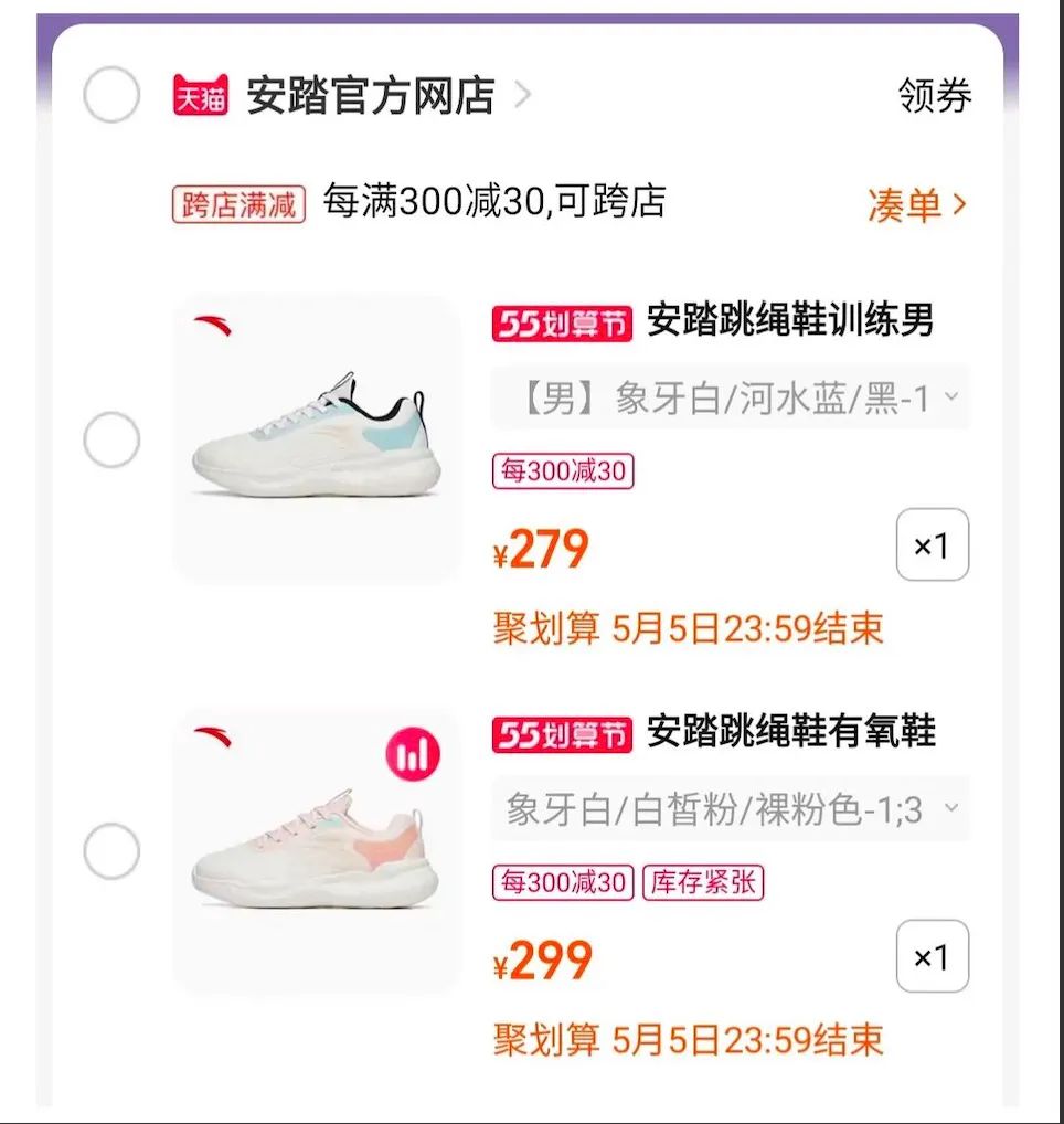 安踏男女款鞋价对比