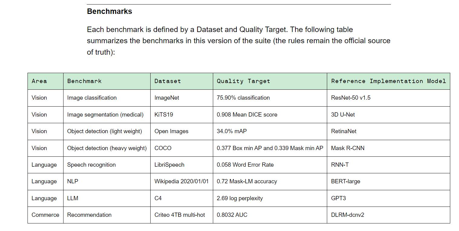 MLPerf是由学术界、实验室和产业组成的人工智能领袖联盟,是目前国际公认的权威AI性能评测基准。Training v3.0包含8种不同的负载,包括视觉(影像分类、生物医学影像分割、两种负载的物体侦测)、语言(语音识别、大语言模型、自然语言处理)和推荐系统。简单来说,就是由不同的设备供应商提交完成基准任务所需要的时间。