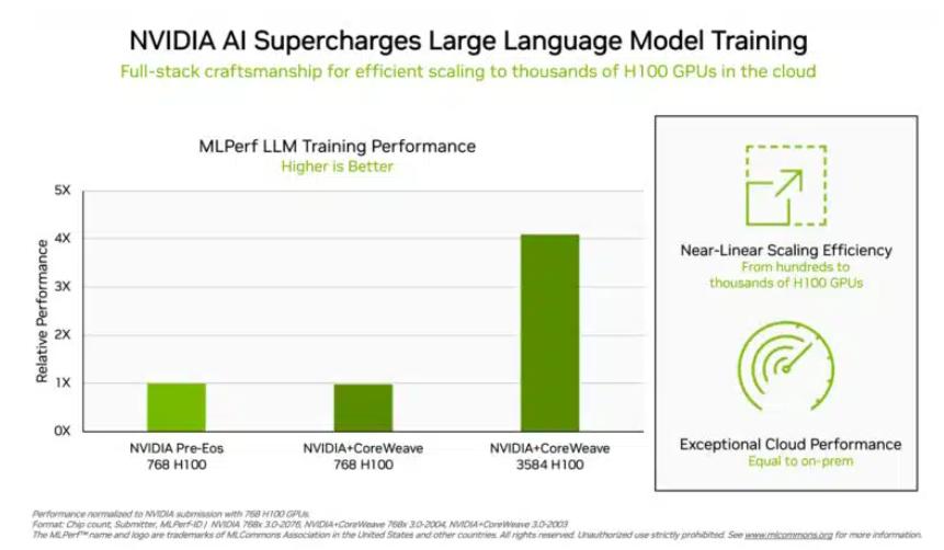 在投资者比较关注的“大语言模型”训练测试中,英伟达和GPU云算力平台CoreWeave提交的数据为这项测试设定了残酷的业界标准。在896个英特尔至强8462Y+处理器和3584个英伟达H100芯片的齐心协力下,仅仅花了10.94分钟就完成了基于GPT-3的大语言模型训练任务。