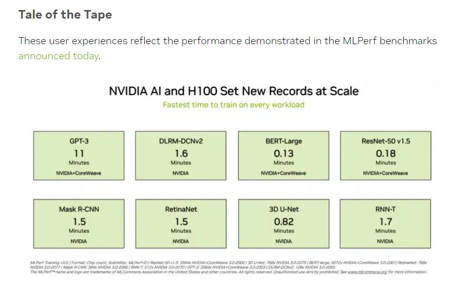 当地时间周二,机器学习及人工智能领域开放产业联盟MLCommons披露两项MLPerf基准评测的最新数据,其中英伟达H100芯片组在人工智能算力表现的测试中,刷新了所有组别的纪录,也是唯一一个能够跑完所有测试的硬件平台。