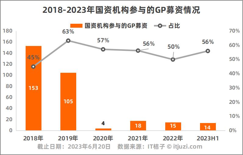 IT 桔子募资数据显示,2018 年以来,至今有 300 多家机构/基金从地方政府、国资机构受众募资过;其中,2018 年就有 153 家机构拿过国资的钱,在当年募资事件的比重为 45%。