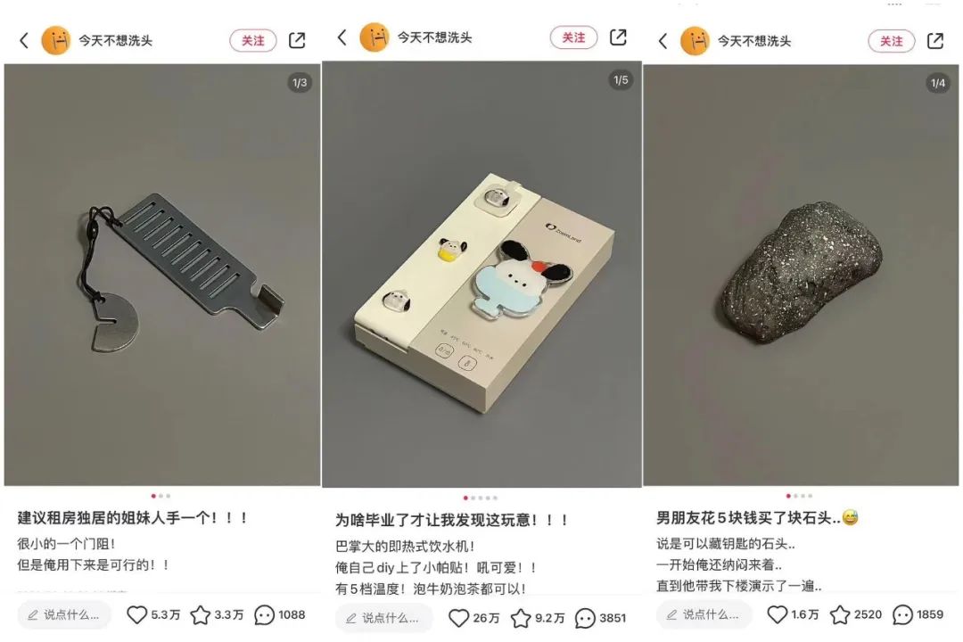 比如 @今天不想洗头,其主页里的内容均为博主为粉丝推荐的生活好物。所有笔记封面都风格统一,以灰色背景下具体的事物为主体,看上去简约大方。更吸引粉丝的,是博主会根据热门话题推荐相关好物:独居租房必备、宿舍生活神器、男朋友买的奇怪物件……不同的主题有着不同的受体群众,能够吸引到更多人的关注。