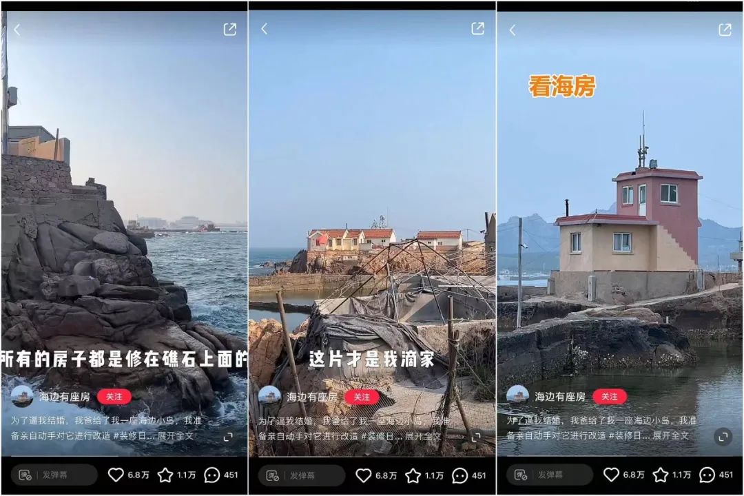 比如去年火遍全网的博主@海边有座房,也是通过老爸在海边给自己留下的“破烂别墅”引入,一步步将其改造成为很多人心中的梦想之家。