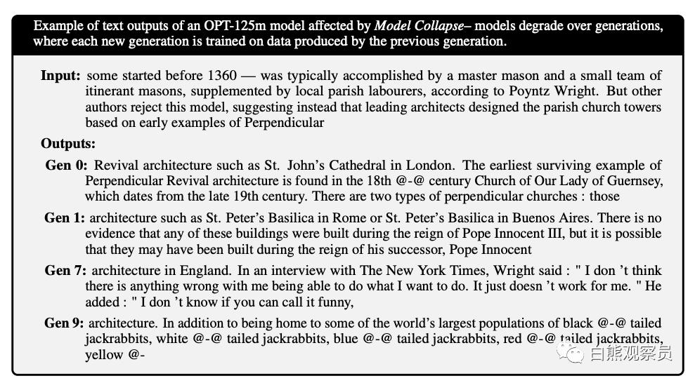 以下是一个受模型崩溃影响的OPT-125m模型文本输出的例子——模型会随着代数的增加而退化,每一代新模型都是基于前一代模型生成的数据进行训练的。