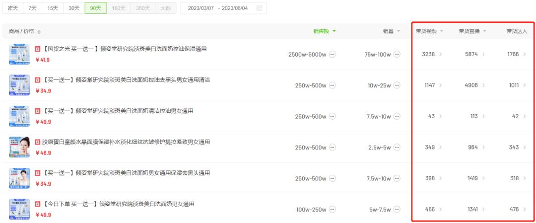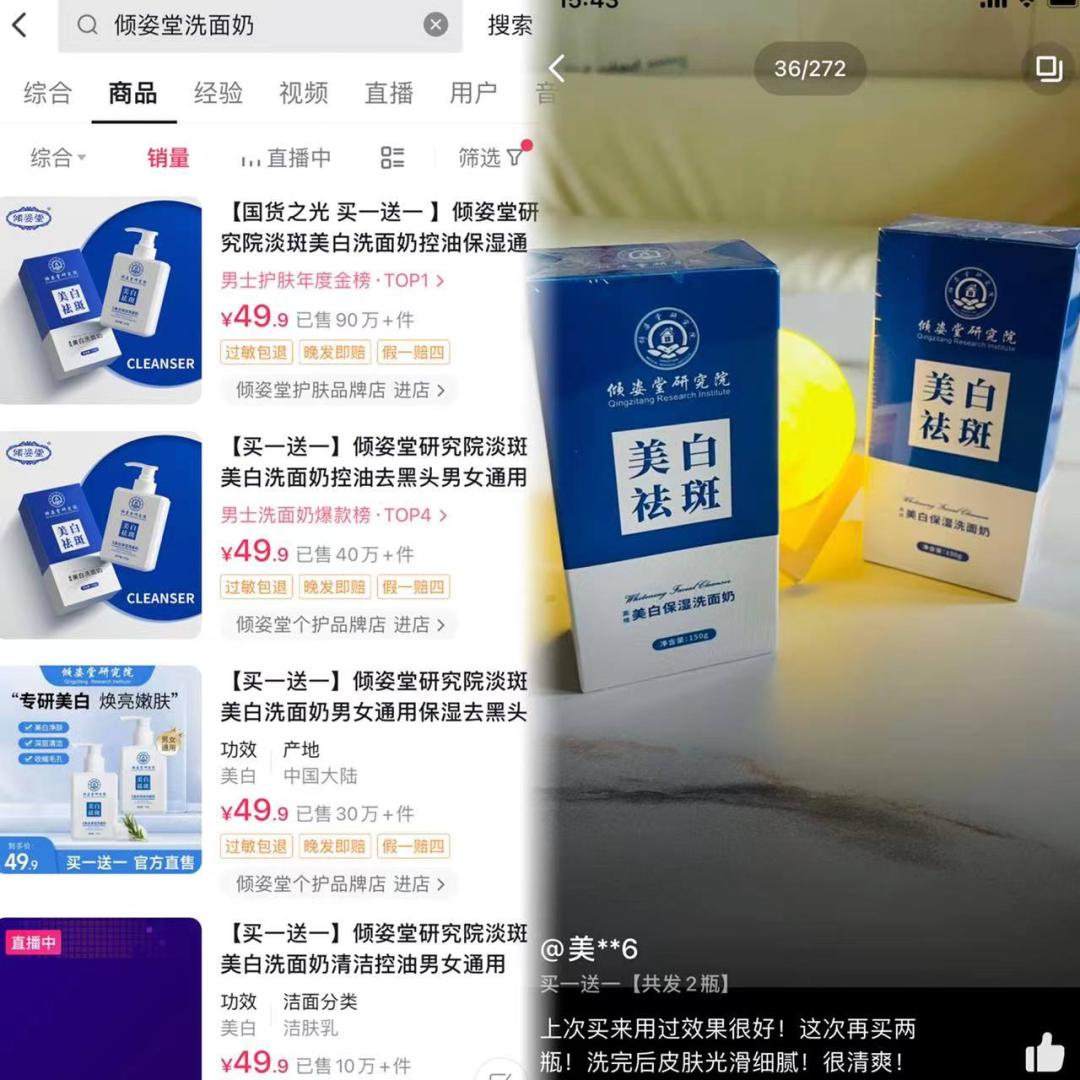 这其中,绝大部分账号是仅带货倾姿堂美白洗面奶这一款产品。