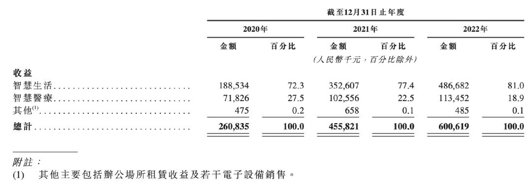 2020年,云知声收入2.61亿元,其中智慧生活1.89亿元,占比72.3%;2021年,云知声收入增长至4.56亿元,智慧生活收入3.52亿元,占比升至77.4%;2022年,云知声收入进一步增至6.01亿元,智慧生活占比达到81%。