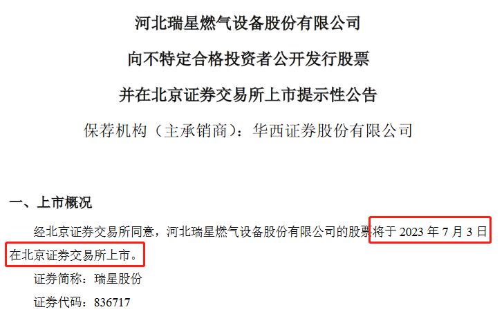 瑞星股份(836717)将于7月3日在北交所上市,同日从新三板摘牌。据介绍,瑞星股份始终专注于燃气调压设备领域,与华润燃气、中国燃气等大型燃气集团建立了长期稳定的合作关系,2023年第一季度净利润增速达到181%。