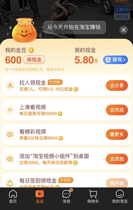 新播场发现,如今进入逛逛后,有类似于“刷视频赚补贴”的功能,首次进入的用户会出现“看淘宝视频10天得XX元”的提示,任务栏里也有诸如“添加‘淘宝视频小组件’到桌面”的文案。