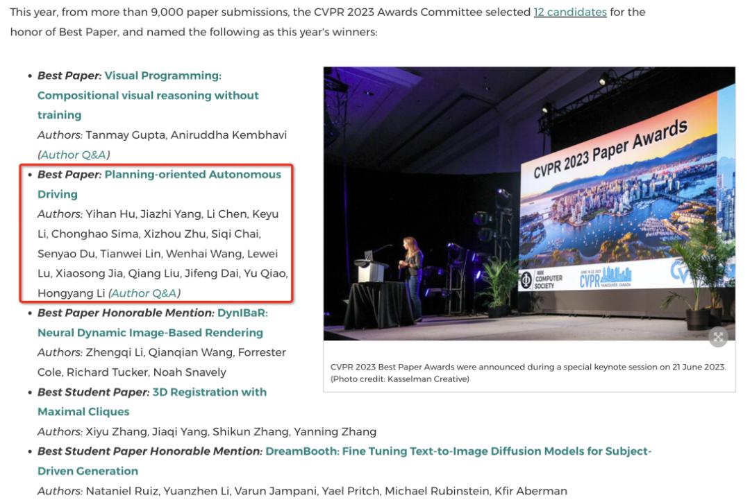 值得一提的是,在最新一届的计算机视觉领域国际顶级会议 CVPR 上,诞生了有史以来第一篇以自动驾驶为主题的最佳论文,这篇论文是《Planning-oriented Autonomous Driving》 ,由来自中国的上海人工智能实验室、武汉大学、商汤科技团队联合发表。