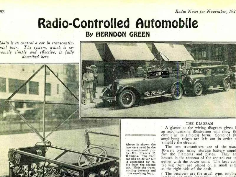 1925 年 8 月,一辆名为「美国奇迹」(American Wonder)的钱德勒汽车出现在繁华的纽约街头,它没有驾驶员,却能通过一套无线电装置控制车辆,实现加速、减速、转弯等操作——这是人类历史上首辆「自动驾驶」车辆。