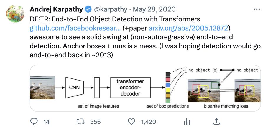 那时候,Andrej Karpathy 已经开始感受到 AlexNet 的强大——他在推特上对竞赛结果的评价是:大型深度网络 + Dropout 算法 + GPU,展示出令人印象深刻的性能。