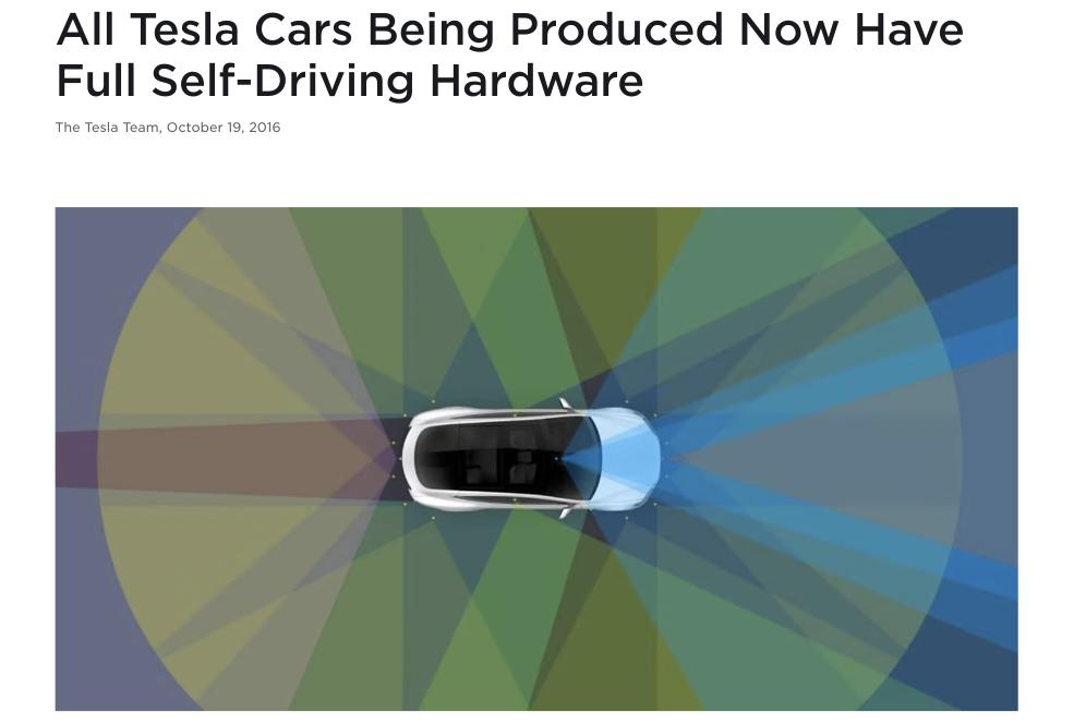 2016 年 10 月,特斯拉宣布:包括 Model 3 在内的所有量产车型将会搭载能够实现完全自动驾驶(Full Self-Driving)能力的硬件(也就是 HW2.0),其中传感器包括 8 颗环视摄像头、12 颗超声波雷达和一颗前向雷达。