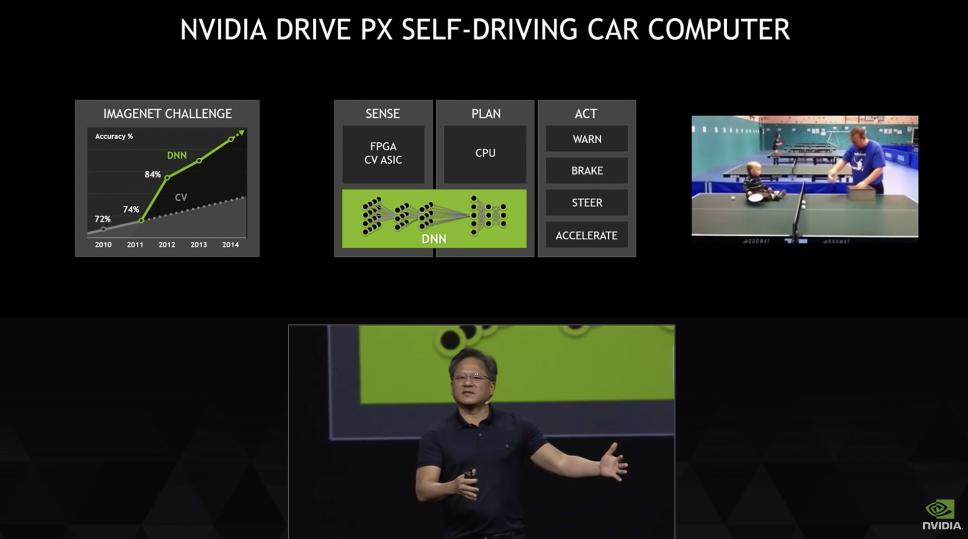 比如说,2016 年年初,英伟达发布了一系列基于自动驾驶平台的软硬件产品,其中包括 DRIVE PX 2——黄仁勋称之为「世界上第一个面向自动驾驶汽车的超级计算机」。